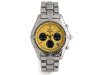 MONTRE CHRONOGRAPHE en acier, cadran jaune 3 compteurs avec chiffre arabe et index bâtons appliqués et luminescents, affichage de la date par guichet à 4 heures 30, échelle tachymètre, lunette tournante graduée. Mouvement automatique. Bracelet acier, maillons articulés avec boucle déployante réglable en acier, signée.