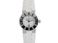 MONTRE BRACELET de dame en acier, cadran blanc stylisé avec chiffre arabe appliqué et index diamantés, affichage de la date par guichet à 6 heures, lunette tournante graduée rehaussée de diamants brillantés et d'émail. Mouvement quartz. Bracelet caoutchouc, façon maillons articulés avec boucle déployante papillon en acier, signée. Elle est accompagnée de sa boîte contenant son écrin et ses papiers.