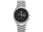 MONTRE CHRONOGRAPHE en acier, cadran noir 3 compteurs avec index bâtons luminescents, affichage du jour en anglais et de la date par guichet à 3 heures, lecture 24 heures, lunette tachymètre. Fond de boîte gravé ''Seamaster''. Mouvement automatique.Bracelet acier, maillons articulés avec boucle déployante en acier, siglée. Vers 1975.