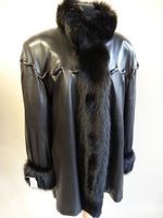7/8ème en cuir Agneau noir, empiècement à effet de laçage, col parmenture et poignets en Renard lustré noir, simple boutonnage à 4 pressions, doublé de Castorette pleine peau lustrée noir.