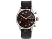 MONTRE CHRONOGRAPHE en acier dans sa version 2 compteurs. Boîte en acier, fond vissé, cadran noir patiné avec chiffres arabes, lunette tournante graduée bidirectionnelle, totalisateur 30 minutes, chronographe avec fonction retour en vol ''fly back''. Mouvement mécanique calibre Valjoux 222. Bracelet cuir avec boucle ardillon en métal. Vers 1955.