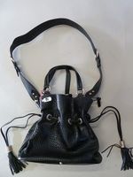 LANCEL Sac "Premier flirt" 30 cm en Veau noir et Veau imprimé façon crocodile, fermeture par un lien coulissant se terminant par 2 pompons frangés, double poignée, anse bandoulière amovible réglable, poche extérieure à rabat. (Bon état).