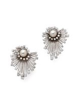 Paire de boucles d’oreille en platine 850 millièmes à décor rayonnant, chacune ornée au centre d’une perle de culture dans un entourage de diamants ronds de taille brillant.(Systèmes pour oreilles percées)Hauteur : 4 cmPoids brut : 29 g