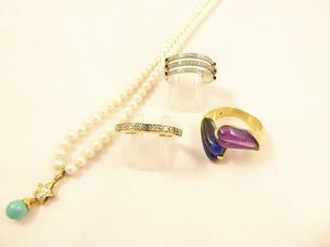 450 / 550 €3 bagues en or et or gris 750 mil (diamants, pierres imitation), (déformations, accidents) + un collier d'un rang de perles de culture retenant un pendentif "étoile" en or (pierres imitation, pierre décorative), fermoir or 750 mil. 32,2 g. brut