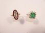 2 Bagues dont une en or gris 750 mil. centrée d'une émeraude taille émeraude dans un entourage de diamants brillantés (TDD : 56) (égrisures) et une marquise en or 750 mil. et platine 850 mil. centrée de roses dans un entourage de pierres imitation rouges (TDD : 56) (manque pierre, éclats). 7,7 g.