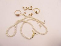 Lot en or 750 mil. : 2 bagues (pierres imitation, ½ perles, usures), 2 paires de boucles d’oreilles (pierres imitation, perles de culture, rubis). Poids brut : 4 g. + collier cassé de petites perles de culture d’eau douce oblongues, fermoir en or 750 mil. 3 perles détachées. A renfiler. En l’état. Poids brut : 6.1 g.
