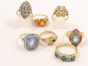 5 bagues en or 750 mil. (Pierres fines, diamants, émeraudes), bague en or 585 mil et argent 800 mil marquise ornée de roses, bague argent ornée d'une pierre imitation bleue et marcassite. (Manque). 34,7 g. brut