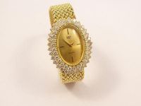 Bracelet-montre de dame "MP" en or 750mil, boîtier ovale rehaussé d'un double entourage de diamants, cadran doré à index bâtons appliqués, mouvement quartz, bracelet à maille polonaise et boucle cliquet en or 750mil. (verre abîmé, bracelet accidenté). 43,2g Brut