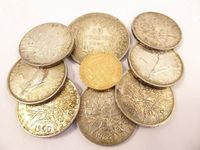 Lot de pièces : 1 x 20FRF "République Française" en or 900mil (6,4g), 1 x 10Francs Hercule en argent 900mil et 7 x 5Francs Semeuse en argent 835mil (salissures). Poids total : 115,5g