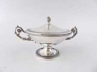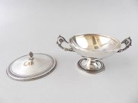 Petite coupe couverte ou sucrier couvert en argent 800 millièmes de style Empire sur piédouche rond à décor de perles et feuilles d’eau. Les anses en petite corne d’abondance, la prise graine du couvercle. Travail italien du XXe siècle. Cygne pour les ouvrages d’occasion. Poids : 219.6 g. H. 10 cm. Léger enfoncement de la prise graine. Bel éta