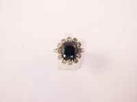 Bague marguerite en or gris 750 mil et platine 850 mil centrée d'un saphir taille coussin dans un entourage de diamants 8/8 et 16/16. (Eclats, manques de matière). (TDD : 55). 5,2 g.