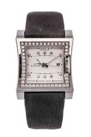 BEDAT & CO GENEVE. Montre d’homme rectangulaire galbée, en acier. La lunette sertie de petits diamants. Cadran argenté guilloché, 10 plots ronds sertis de petits diamants pour les heures. Mouvement mécanique à remontage automatique, trotteuse centrale, datographe guichet à 3h. Bracelet cuir et satin noir, boucle ardillon acier d’origine. N°0539. Référence : 114. Avec son certificat.