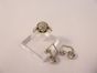 Bague solitaire en or gris 750 mil à chaton rond pavé de diamants 16/16 et 8/8 (TDD : 52). 3,5 g. Paire de dormeuses en or gris 750 mil serties d'un diamant brillanté, rehaussées d'un diamant 8/8. 4,7 g.