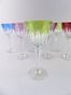 7 verres à pied en cristal Roemer (bleu, grenat, violet et vert olive), modèle à base ronde unie, la jambe à pans et la paraison taillée de petites feuilles et pointes de diamant. Travail moderne. H. d’un verre 19.4 cm. Usures et rayures notamment de la couleur violette sur un verre et un pied cassé recollé sur un de couleur verte.
