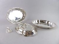 Paire de 2 légumiers ovales en métal argenté dont un couvert dit ENTREE DISH à prise du couvercle amovible pour former un autre plat creux. Modèle contour à décor de perles et agrafes de feuilles de céleri. Le couvercle monogrammé. Travail anglais, XXe siècle. Anciennes traces de rayures, repolissage et réargenture moderne. Très bel état. Parfait pour l’hôtellerie. L. 31 cm. H. couvert : 12.8 cm. L. du couvercle : 29.5 cm.