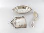 RAVINET D’ENFERT (actif 1891-1912), période Art Nouveau : corbeille à pain (L. 37 cm) et pelle (dim. 22.7 x 20.3 cm) et sa brosse ramasse-miettes (L. 30.2 cm) en métal argenté, modèle chantourné de style Louis XVI à décor de filets feuillagés et iris. Chiffrées RF ou RG. Poinçon de Maître. Très légères usures. Très bel état.