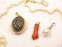 3 pendentifs : 2 en or 750 mil (perle de culture, corail) et 1 ouvrant en or 750 mil et argent 800 mil (pierre décorative, roses). Collier de perles de culture en chute, fermoir en or 750 mil. 33,2 g. brut