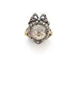 Bague en or jaune 750°/oo et argent 925°/oo, àdécor de noeud ornée au centre d’un diamant tailléen rose sous clinquant dans un entourage de petitsdiamants, également taillés en roses.(Manque au diamant principal, manque des petitsdiamants et cassure sur l’anneau)Tour de doigt : 48 1/2Poids brut : 8.3 g