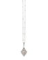 Collier articulé en or gris 750°/oo, les maillonsagrémentés de petits diamants ronds de tailleancienne, retenant en pendentif un motif en platine850°/oo également orné de diamants ronds detaille ancienne, la partie du centre mobile.(Transformation)Longueur de la chaîne : 40 cm environ.Poids brut : 9.3 gHauteur du pendentif : 4.5 cm