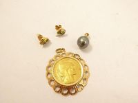 Lot en or 750 mil. : 2 pendentifs (perle de culture grise cerclée, pièce de 20 FF or 900 mil), paire de boutons d’oreilles (émeraudes, diamants). Poids brut : 11.8 g. Usures et déformations.
