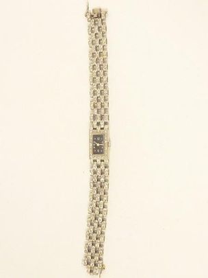 900 / 1 200 €Bracelet-montre de dame en platine et or 750 mil sertie de diamants 8/8 (0,70 carat environ au total), cadran noir, mouvement à quartz. 44,1 g. brut