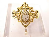 Broche en or 750 mil et platine 850 mil entrelas de godrons enrichie de motifs floraux diamantés et petites perles fines. 10,3 g. brut