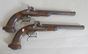Paire de pistolets à percussion, platines à corps plat joliment gravé, fûts courts sculptés à l'avant et crosses quadrillées, et ornées d'une rosace au pommeau, canons octogonaux rayés et portant des traces de damas. Ces armes de bonne qualité sont signées sur les platines BARADAT à Bordeaux. Longueur canon : 24,5 cm - Longueur total : 39 cm. Bon état de conservations et d'usage. Epoque Charles X