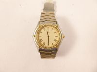 E) (art 524 bis du CGI, al c) : Bracelet-montre de dame EBEL "Wavelady" en acier et or 750 mil, boîtier rond, lunette sertie de diamants brillantés et de vis, cadran crème, chiffres romains appliqués, mouvement à quartz, bracelet à maillons vague et boucle à cliquet en acier, signé et numéroté (diamètre : 26 mm environ). (Longueur : 17,5 cm). (Légères rayures). 42 g. brut