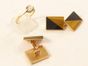 Paire de boutons de manchette en or 750 mil à plateaux rectangulaires orné d'une plaque d'onyx et d'oeil de tigre, bague en or 750 mil ornée d'une rose couronnée accidentée. (TDD : 58). 14 g. brut