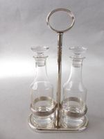 CHRISTOFLE, Période contemporaine : huilier-vinaigrier en métal argenté et cristal. Modèle à moulures de filets, la tige centrale à prise annulaire moulurée. Signé. Nouveau poinçon Christofle d’après la réforme du poinçon carré de 1983. H. 25.6 cm. Les deux flacons en cristal de la maison italienne Mario CIONI. H. 17.5 cm. Boîte de rangement Christofle. Très bel état.