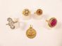 Lot en or 750 mil : 4 bagues dont 1 en or et platine 950 mil (pierres imitation, diamants TA et roses) (déformation) (TDD Toi et Moi : 58), pendentif (pierres imitation). 16,6g