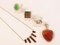 Lot en or 750 mil : collier (pierres décoratives, diamants brillantés), pendentif "coeur" (pierre décorative), 3 bagues (pierre fine, pierre décorative, diamant TA, diamant brillanté, roses). 23,8g