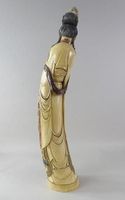 Défense d'éléphant en ivoire sculpté, polychromie et or, figurant une Divinité, un phénix à ses pieds. Cachet sous la base. Chine, vers 1930. Hauteur : 70 cm. (Petits manques et frottements)