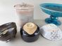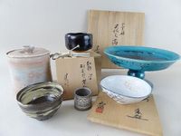 Ensemble de céramiques japonaises contemporaines : - Coupe sur pied en terre cuite à glaçure turquoise à effet de craquelures et motifs noirs, signée (Diam. : 29 cm ; Haut. : 15 cm) ; - Pot à gingembre en terre cuite émaillée nuancé beige, cachet (Haut. : 17 cm) ; - Coupelle ronde en grès à couvercle blanc nuancé (Diam. : 15 cm) ; - Raku, bol et un support en grès à couverte noire, marron nuancé crème et vert . Avec 5 boîtes en bois.