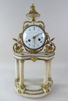 Pendule portique en marbre blanc et bronze doré, cadran émaillé blanc à chiffres romains et arabes signé FESTEAU LE JEUNE A PARIS, surmontant quatre colonnes. Garniture en bronze doré à décor de rinceaux feuillagés, cassolettes, rangs de torsades, de perles et mascaron. Seconde moitié du XVIIIème siècle. Avec balancier à tête rayonnante et deux clés. Dim. : 50 x 25,5 x 13 cm. (Accidents et manques)