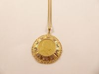 Collier en or 750mil composé d'une chaîne retenant un pendentif serti d'une pièce de 20FRF "Louis XVIII" en or 900mil (chocs) (Long : 58 cm environ). 22,2g