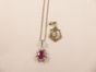 Collier en or gris 750mil retenant un pendentif centré d'un rubis taille poire dans un entourage de diamants brillantés, chaînette de sécurité en or rhodié 750mil (5,8g) + un pendentif en or rhodié 750mil (pierres imitation). 7,3g au total