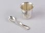 CHRISTOFLE, période contemporaine : timbale tulipe Ourson chiffrée EVE et cuiller bébé du même motif monogrammée EFC. Signées. Nouveau poinçon de fabricant de la maison. Très bel état. Quasi neuf.