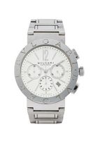 BULGARI. Automatic. Montre d’homme ronde (diamètre : 42mm) en acier. Lunette gravée «BULGARI». Fond à vis. Cadran argenté, guilloché «pointes de diamants», 3 compteurs, 1 chiffre arabe et index en applique, trotteuse centrale, datographe guichet entre 4h et 5h. Mouvement mécanique faisant chronographe, à remontage automatique. Bracelet acier et fermoir double dépliant, d’origine. N°BB 42 SS CH. O 2638. Poignet : 17,4cm. Sans écrin ni papiers.