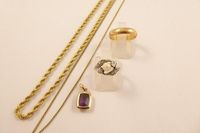 Lot comprenant 2 colliers et un anneau en or 750 mil (TDD : 52), une bague en or 750 mil et 850 mil sertie de perle de culture, diamants TA et roses (TDD: 45) et un pendentif en or 375 mil (améthyste). 11,9g