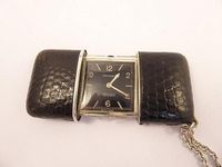 Montre de voyage MOVADO Ermeto en argent 800 mil et cuir, cadran noir à chiffres arabes et index, mouvement mécanique, avec chaîne ARTUS BERTRAND en argent 925 mil (longueur: 48 cm environ)(usures). 92 g brut.