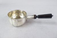 Alphonse DEBAIN (actif 1883-1911) : casserole à sauce en argent 950 mil uni. à manche latéral en bois noirci à pans. Poids net pesable : 172.5 g. avec le manche 197.7 g. L. 20 cm. Diam. 8.8 cm. H. 5 cm. Légères rayures et déformations. Bel état. Non chiffrée.