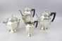 CHRISTOFLE-GALLIA, Années 1930-1950 : service à thé-café en métal argenté, modèle ovoïde sur piédouche à pans et godrons comprenant 1 théière (H. 20 cm), 1 cafetière (H. 23.7 cm), 1 pot à lait (H. 11.7 cm) et 1 sucrier couvert (15.8 cm). Les prises et becs à coquille. Les anses en ébène. Signé GALLIA et numéroté 5834. Poinçons de Gallia (après 1937) et de Christofle (après 1935). Rayures d’usage. Bel état général de conservation.