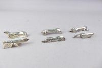 Edouard-Marcel SANDOZ (1881-1971), édition CHRISTOFLE-GALLIA, Années 1930 : 4 porte-couteaux animaliers en métal argenté figurant un chien, un cochon, un canard, un chat. Signatures estampées O. GALLIA (sur le chien et le cochon) et GALLIA (sur le canard et le chat). Poinçon de fabricant OC cavalier d’échec (sur le cochon, le canard et le chat), poinçon de maître CC sur le chien. Légères rayures. Bel état.On y joint trois porte-couteaux animaliers modernes en métal argenté d’après Sandoz figurant une sauterelle, un coq et un phoque. Non signés. Bel état.