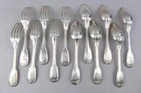 Etienne-Henri SANONER, période SECOND EMPIRE : suite de six couverts de table en argent 950 mil., modèle à filet. Armoiries comtales. Minerve 1er titre et poinçon de Maître (actif 1852-1868). Poids : 1099.7 g. Légères rayures. Très bel état.