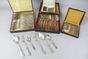 Lot de couverts et cuillers à café de la fin du XIXe siècle et du début du XXe siècle :- 12 cuillers à café à filets par ARGENTAL (9) et Procédé RUOLZ (3). Ecrin.- 12 grandes fourchettes et 11 grandes cuillers, modèle baguette, de deux différents orfèvres. Ecrin accidenté.- 1 grande cuiller CHRISTOFLE de style LOUIS XVI chiffrée.- 11 cuillers à café par TRIBAUDEAU de style Transition à filets violonés, coquille et feuillages. Ecrin.- 12 grands couverts par ARMAND FRENAIS (actif 1877-1927), modèle de style LOUIS XVI chantourné à lauriers, filets et coquille. Signés. Ecrin accidenté.Rayures et usures d’usage.