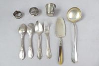 Lot en argent 950 mil du XIXe siècle : - Timbale tulipe à décor pastillé et guilloché, le cartouche rocaille non chiffré. Minerve 1er titre et poinçon de maître Charles HACQ & Achille HOURDEQUIN (actifs 1884-1902). Poids : 42.7 g. Bosses et rayures. H. 6.4 cm.- Rond de serviette (très accidenté) par MASSAT Frères (actifs après 1885) et bouchon de flacon rocaille avec sa monture de col (intérieurs vermeil, bosses) par Henri SOUFFLOT (actif 1884-1910). Minerve 1er titre.Poids total : 110.1 g.Lot en métal argenté du XIXe et début du XXe siècle :- 6 grandes fourchettes et 4 grandes cuillers à lauriers et filets rubanés par ERCUIS. Rayures.- 1 pelle à tarte à manche en corne, la pelle ovale guillochée. Légères fentes. L. 28.5 cm.- 1 louche modèle baguette, non chiffrée. L. 31.8 cm. Usures et rayures.