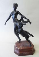 Joe DESCOMPS (1869-1950) "Jeune femme demi-nue drapée courant avec une biche" Bronze à patine argentée, signé sur le socle en marbre brèche. Hauteur totale : 45,5 cm