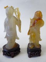 Six statuettes en agate veiné de rouille représentant de vénérables sages. Chine, XXème siècle. Avec socles en bois. Hauteur (hors socle) de 6,5 à 8 cm.