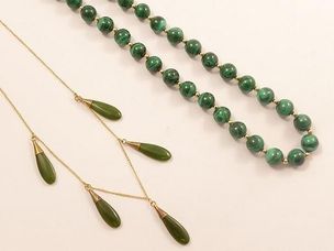 80 / 120 €Collier d'un rang de boules de malachite, intercalées de perles en or 585 mil. Fermoir en or 585 mil. (Longueur : 45 cm environ ; Diamètre moyen des boules de malachite : 9mm). 60,1 g. brut+ A CASSER EN CAS DE VENTE : Chaîne en or 375 mil. retenant des pendeloques en pierres décoratives et métal. (Nouée). 5,2 g. brut